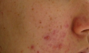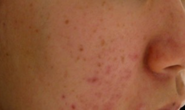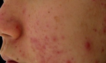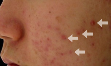 C10 ローションのイオン導入によりざ瘡皮疹の改善が認められる一方で、コントロールでは皮疹が軽快しているものの、新生皮疹(矢印部位)が認められる。