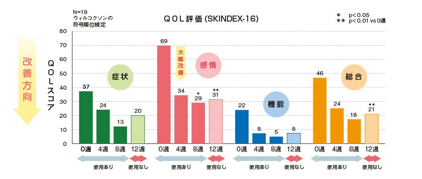 試験品の使用開始4週で、患者QOLは大きく改善しました。特に0週で69あった感情のスコアは8週で有意に改善しました。また、有意な差ではありませんが、12週(試験品の使用終了後4週)には、QOLのスコアは再び悪化の方向に転じました。