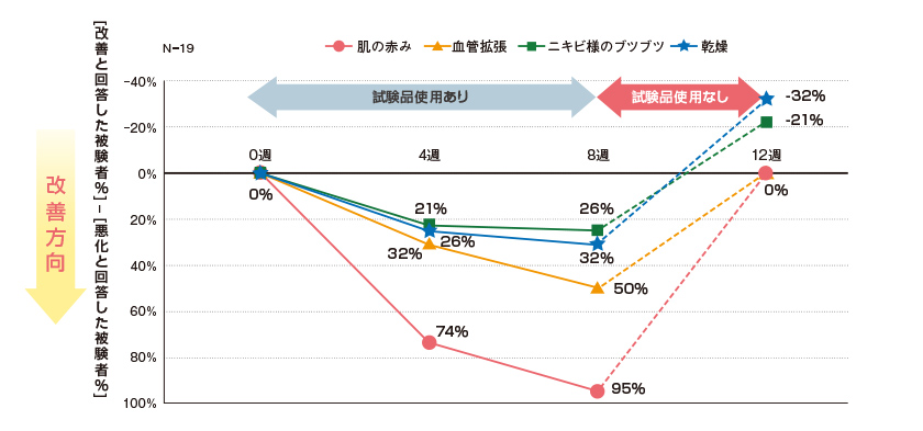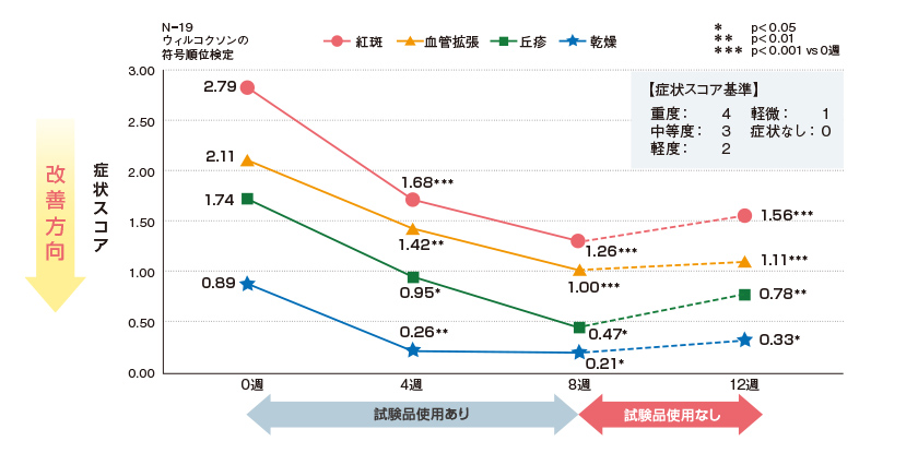 紅斑、血管拡張、丘疹、乾燥いずれの症状も、試験品の使用開始4週で有意に改善しました。その後も、8週まで改善傾向は継続しましたが、12週(試験品の使用終了後4週)には、症状は再び悪化の方向に転じました。